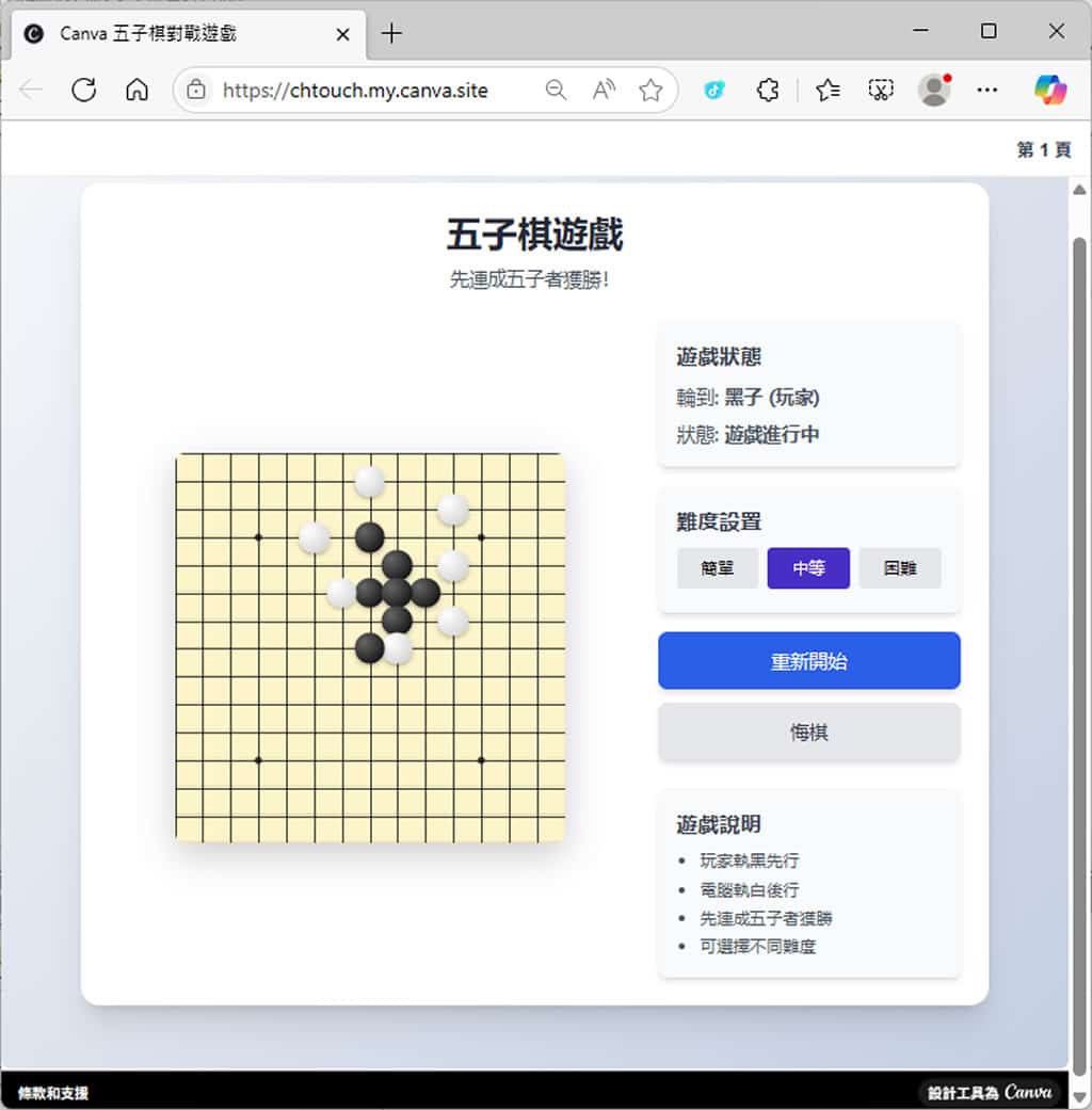 2.輸入想要的程式功能描述,例如:寫一個用戶與系統對戰五子棋的小遊戲,再點選「幫我撰寫程式碼」,就會由 AI 撰寫程式碼,稍後,就會看到可真正遊戲的頁面。
