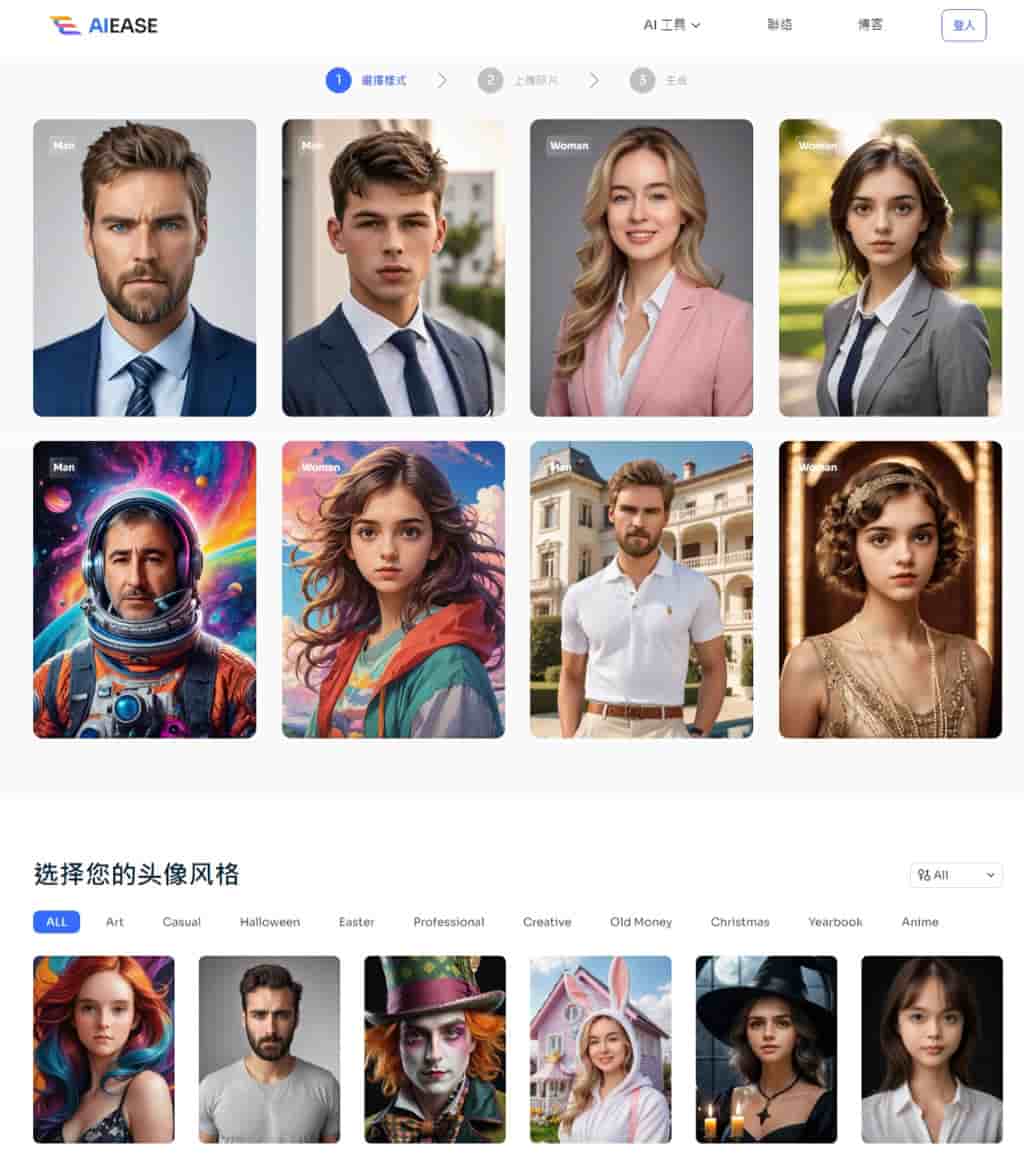 1.使用瀏覽器進入 AI Ease Headshot Generator 網站,可以看到系統所準備的包含 Creative、Art、Professional、Christmas、Halloween、Yearbook、Old Money、Casual、Anime 及 Easter 上白種各種不同風格的模板,而我們要做的第一件事就是先挑好要套用的模板。