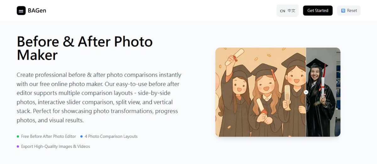 進入 BAGen 網站,你會立即看到一個由該工具製作的滑桿式照片對比示範影片,讓你直觀了解工具的製作效果。這個即時展示不僅展現了工具的專業水準,也讓使用者在操作前就能預期最終成果。