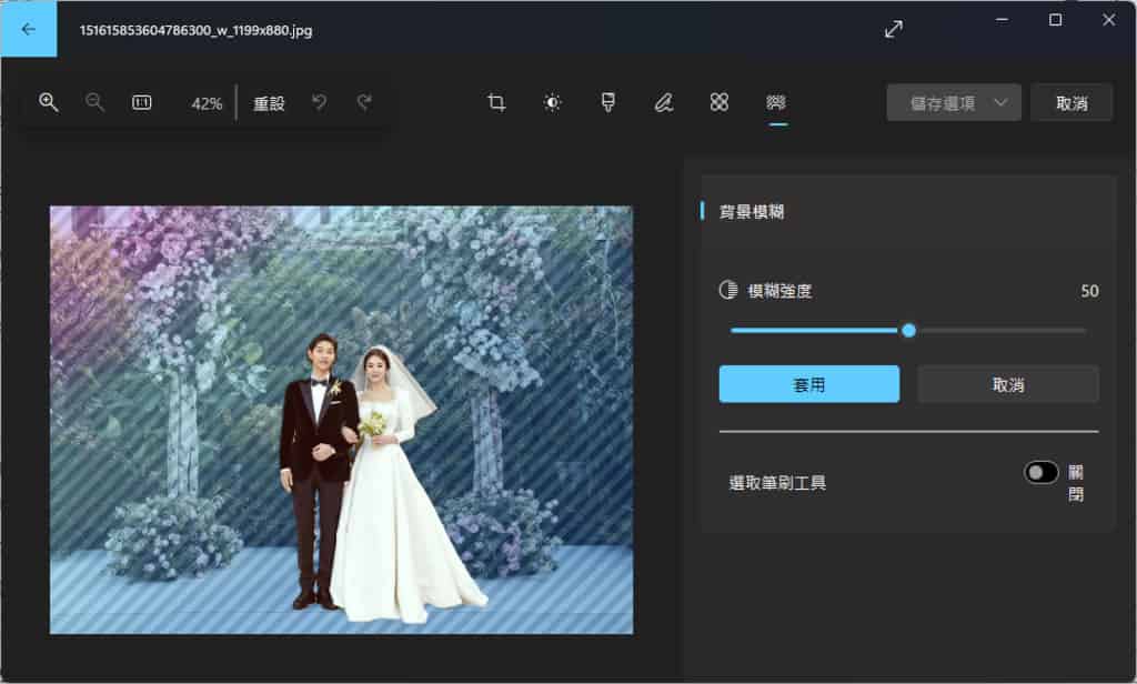 3.「相片」應用程式會自動識別並圈出被視為背景的區域,而模糊強度預設為50,可以自行調整。