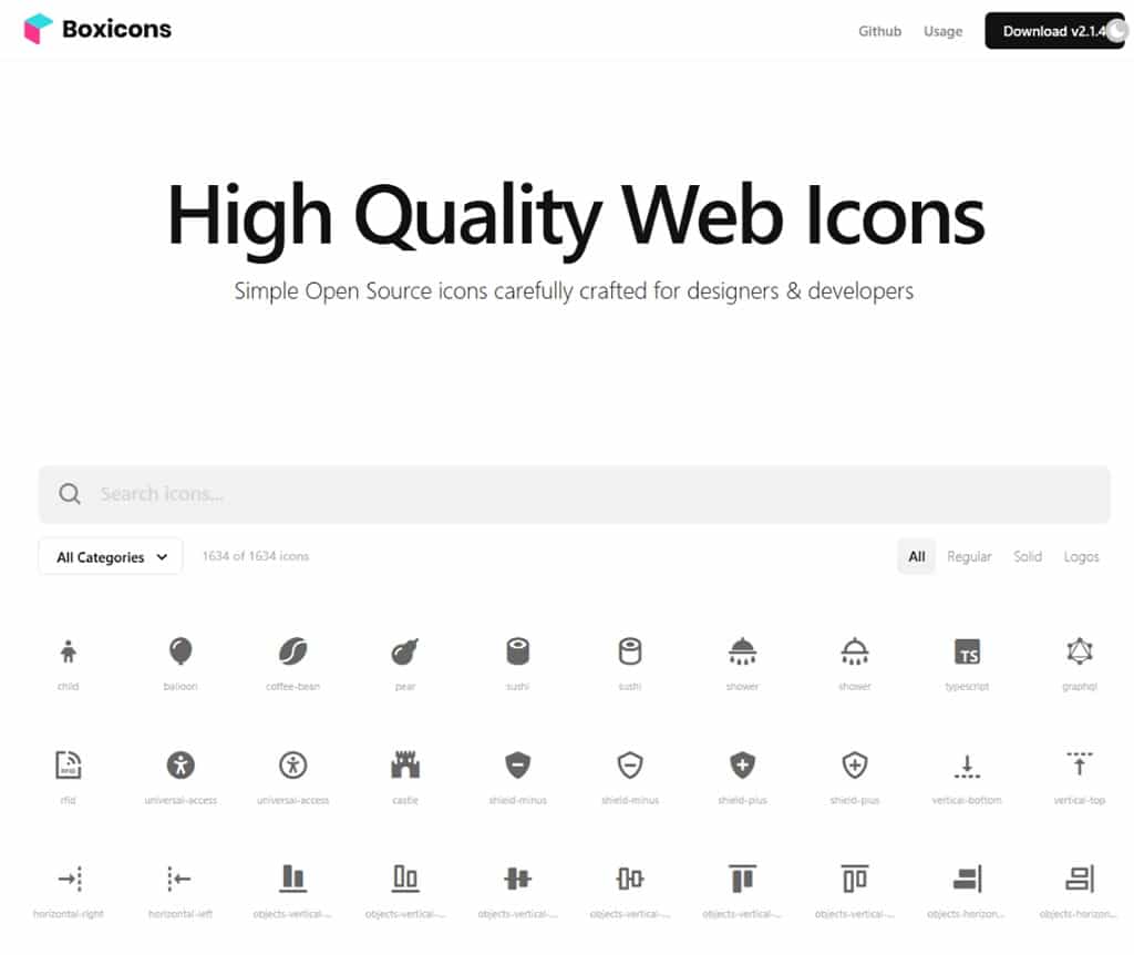 Boxicons 是一個提供 MIT 授權的免費圖示資源庫,內含 1,634 個 SVG 圖示,涵蓋 32 種分類,包括無障礙設計(Accessibility)、警示(Alert)、動物(Animals)、箭頭(Arrow)、品牌(Brands)、建築(Building)、商業(Business)、程式碼(Code)、通訊(Communication)、設計(Design)、裝置(Device)、電商(E-Commerce)、表情符號(Emoji) 等,適合各類型的網站開發與 UI/UX 設計。