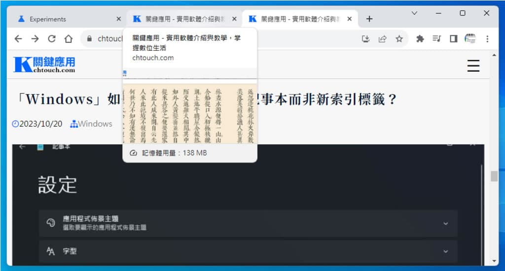 除了使用 Chrome 瀏覽器的內建功能來自動控制分頁的記憶體使用外,還有一個選項就是啟用「Show memory usage in hovercards」功能。這個功能使當滑鼠停留在分頁上時,除了顯示該分頁瀏覽網頁的縮圖外,還會顯示分頁目前所使用的記憶體量。雖然這個功能是實驗性的,但它確實有助於使用者在不必打開「Google Chrome 工作管理員」的情況下,即能了解各分頁的記憶體使用情況,藉此更好地判斷哪些分頁應該被關閉。