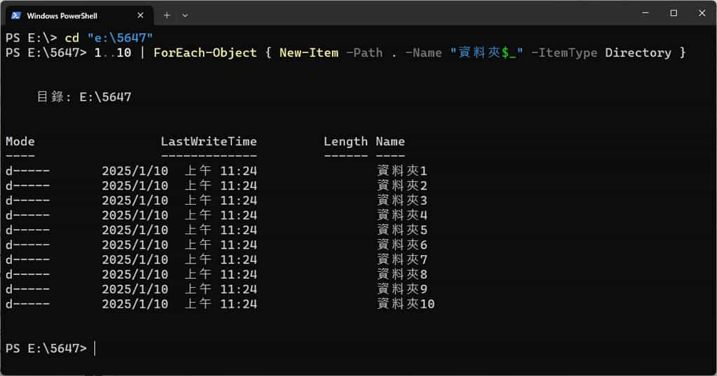1..10 | ForEach-Object { New-Item -Path . -Name "資料夾$_" -ItemType Directory }