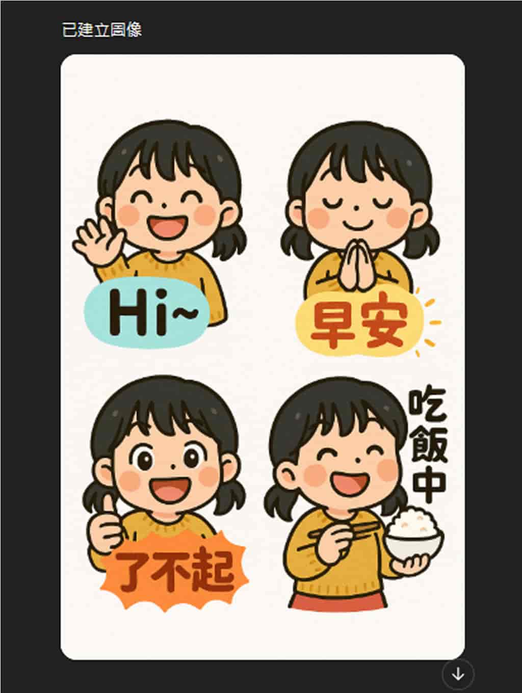 2.上傳上圖給 ChatGPT 後,輸入提示詞(Prompt)來生成角色貼圖。ChatGPT 可以生成風格一致圖片的關係,能確保角色在不同表情或動作中的造型維持一致性,讓整組貼圖看起來更專業。