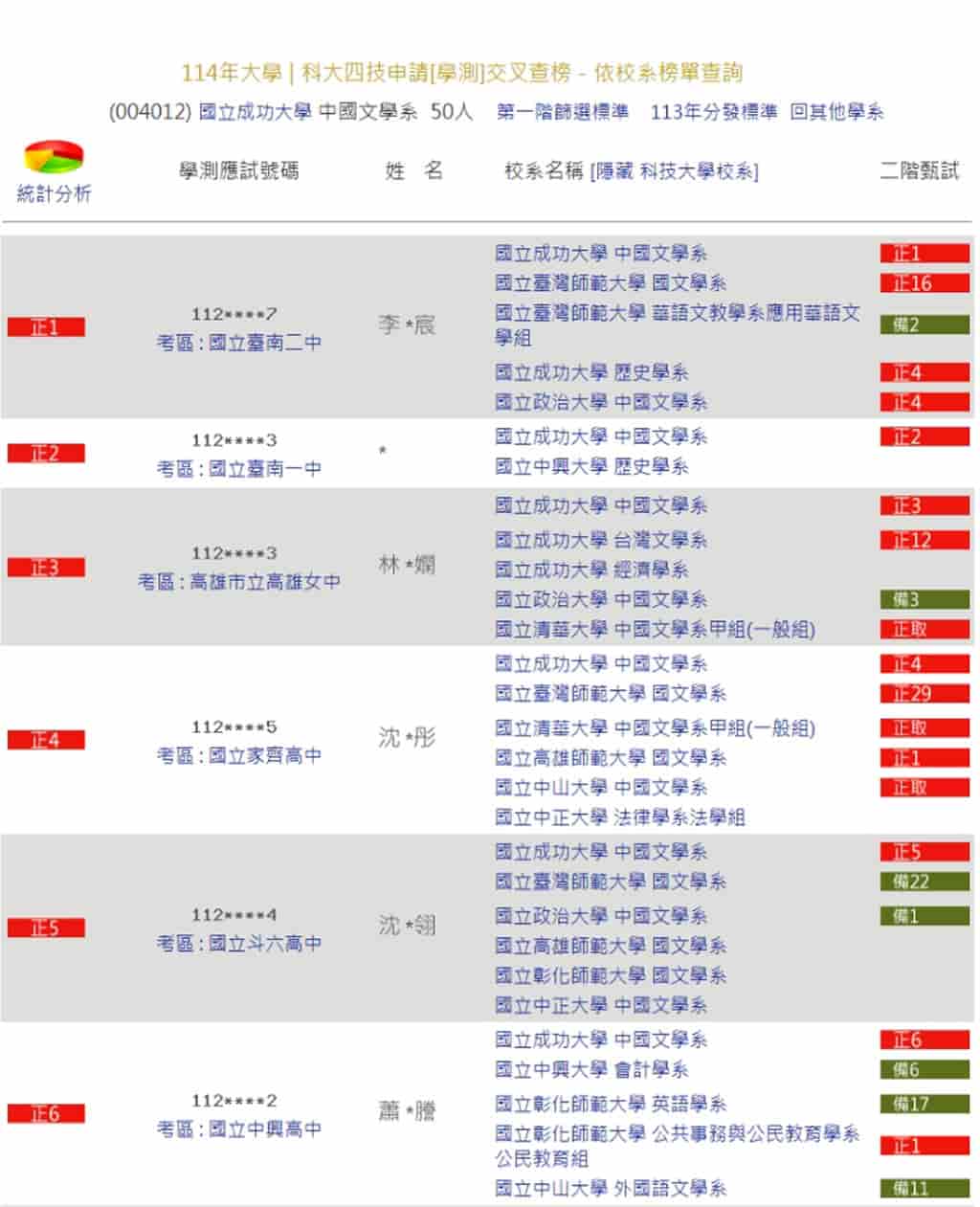 3.以點選中國文學系的交叉查榜來說,進入後就可以看到每位考生的排名及該考生還有被錄取的其他校系排名。