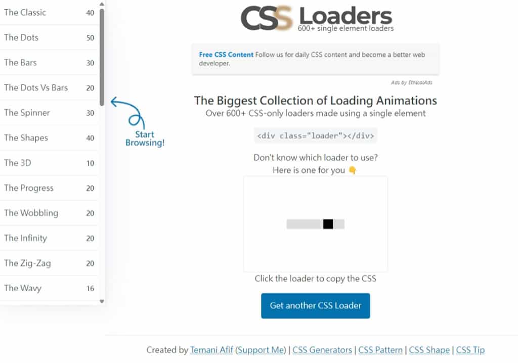 CSS Loaders 收錄了超過 600 個以 CSS 製作的載入動畫範例,並根據形狀或動作分為近 40 種分類,包括 Classic、Dot、Bar、Dot VS Bar、Spinner、Shape、3D、Progress、Wobbling、Infinity、Zig-Zag、Wavy、Flipping、Pulsing、Cut、Blob、Arrow、Maze 及 Line 等。每個 Loader 都可以在線上預覽,並且一鍵就能複製所需的 CSS 語法以供後續使用。
