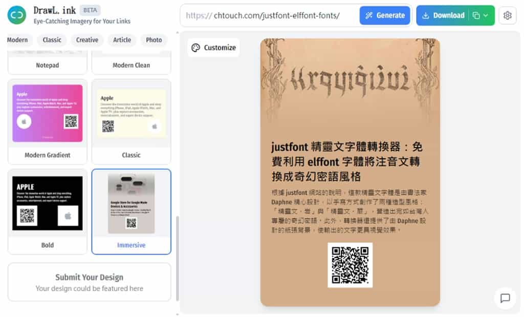 2.接著,輸入想要製作成卡片的網址,點擊「Generate」按鈕,DrawLink 會自動擷取網址中的內容,並依據所選的卡片樣式,快速生成符合樣式的視覺卡片。