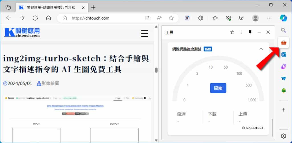 首頁操作技巧瀏覽器 「Edge」如何利用內建網路速度測試功能,輕鬆掌握網速表現? 無論是網頁瀏覽、影片播放還是遊戲娛樂,都需要快速且穩定的網路支援。因此,網速的表現至關重要。若想了解申請的網速與實際表現的差距,通常就是利用網路測試工具。想要取得這些網路測試工具,也不麻煩,如果是使用 Edge 瀏覽器,那麼就可以利用內建的 Speed test 網路測試工具來進行網路測速工作,隨時掌握網路效能表現,無須額外安裝任何工具。 🔔 不錯過任何精彩! 立即訂閱我們的 LINE 官方帳號 每次發佈新文章時,您將會第一時間收到本站文章連結通知,輕鬆掌握最新資訊! 使用 LINE 追蹤文章更新 §相關文章,還可以參閱:如何在 Chrome 中顯示 / 隱藏 AI 模式按鈕?flags 設定教學Google AI 模式正式支援繁體中文:一次搞懂功能、應用與影響Edge 不用開側邊欄!網址列直接輸入提示詞就能 AI 生圖與搜圖Edge、Chrome 瀏覽器複製已開分頁到新分頁,這招你一定要學起來Edge Android 版新增底部網址列功能,來看怎麼設定 隨時隨地測試網路速度,取得更流暢的上網體驗 1.要使用 Microsoft Edge 的網路速度測試功能,需先更新到 124.0.2478.80 版本以上。 2.開啟側邊欄,點擊「工具」按鈕,下拉網頁找到網際網路速度測試工具。 3.點擊「開始」就能進行測試,並取得延遲、下載及上傳等三項數據。 測試網路速度的工具不少,可參閱免費網路速度測試工具一覽表,但能被微軟相中且綁到 Edge 中來使用,肯定也有其獨特性及準確性。