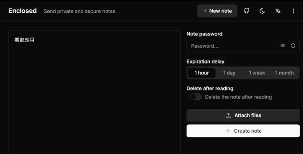 Enclosed 是一個強調安全性的端對端訊息傳送工具,採用 AES-GCM 加密技術以及 PBKDF2 派生的 256 位元金鑰,專門用於傳送私密訊息及附件。Enclosed 設計獨具特色,使用者在輸入訊息後,會自動生成一個專屬的訊息網址供分享,並可搭配多種安全性選項,包括設置開啟密碼、訊息到期時間(1 小時、1 天、1 週或 1 個月),或選擇「閱後即焚」的功能,使訊息在閱讀後自動刪除,確保內容不留痕跡。Enclosed 的這些功能讓訊息在傳輸過程中加密保護,並在閱讀後也得到安全保障,對想安全傳遞私密訊息者來說可以考慮使用。