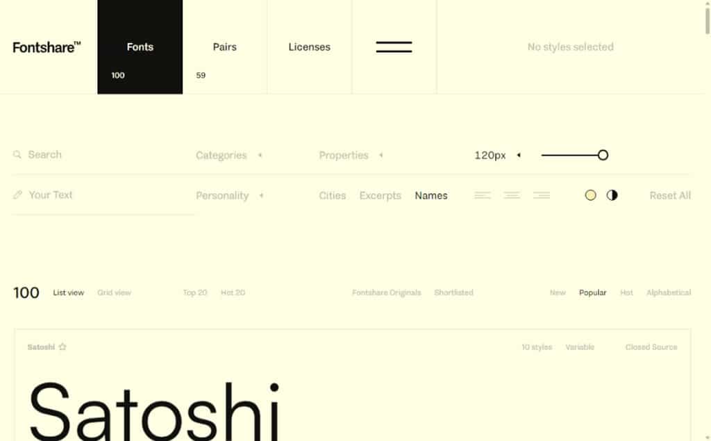1.進入 Fontshare 網站後可搜尋字型名稱或使用 Categories、Properties、Personality 等條件篩選字型,在 Your Text 輸入要預覽的字體及調整字體大小、對齊方式,另外 Cities、Excerpts 及 Names 則可選字體要顯示的文字,預設是用字型名稱。