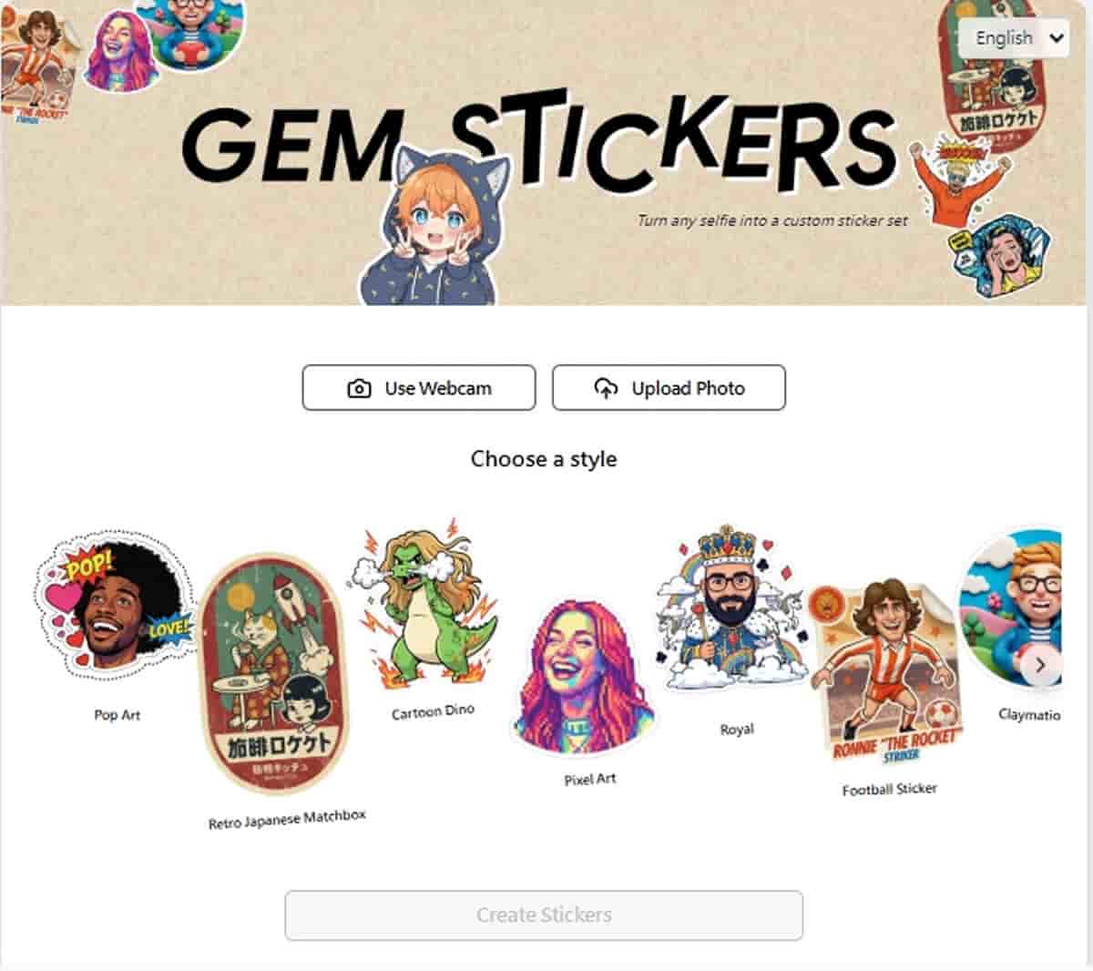 打開 Gem Stickers 網站後,你會看到兩個選項:「Use Webcam」(使用網路攝影機)和「Upload Photo」(上傳照片)。如果你想即時自拍,可以選擇第一個;如果已經有準備好的照片,就選擇上傳照片。