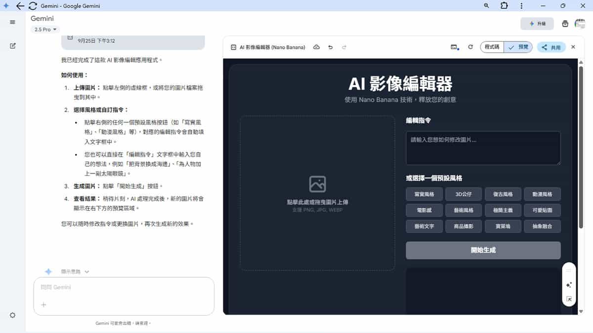 現在,你就可以開始使用 Gemini 的 Canvas 模式,開始打造自己的 Nano Banana 圖像處理 App,並將生成的網址,分享給你的親朋好友一起來使用。