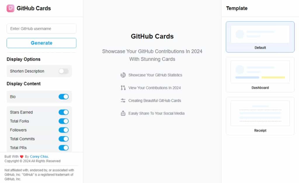 GitHub Cards 是展示技術成果與專業實力的實用工具,無需繁瑣設置,即可將自己的 GitHub 成就數據轉化為引人注目的精美卡片。不論是用於個人品牌打造、求職履歷增色,還是向社群分享您的開源貢獻,GitHub Cards 都能讓自己的努力更具吸引力。