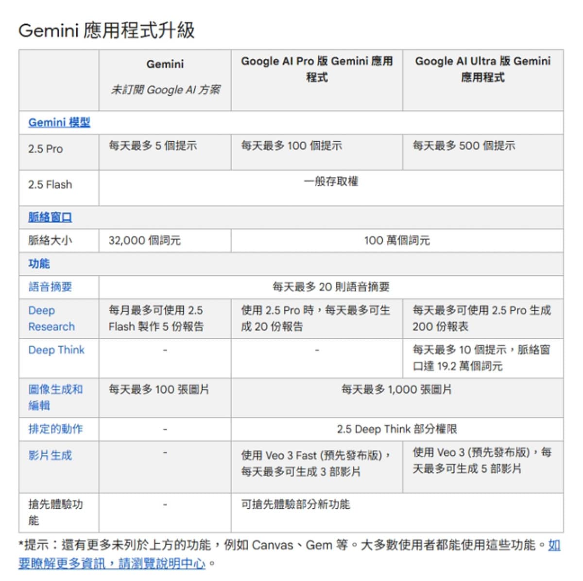 不過,好消息來了!Google 近日終於在官方支援頁面(https://support.google.com/gemini/answer/16275805)公開了完整的版本比較資訊,為想要訂閱的用戶提供明確的升級指引。如果你也在考慮要不要升級 Gemini 付費版,現在終於有明確的數字和功能差異可以參考了。今天我們就根據 Google 官方最新資料,為你完整解析各版本的功能差異,幫你做出最明智的選擇。