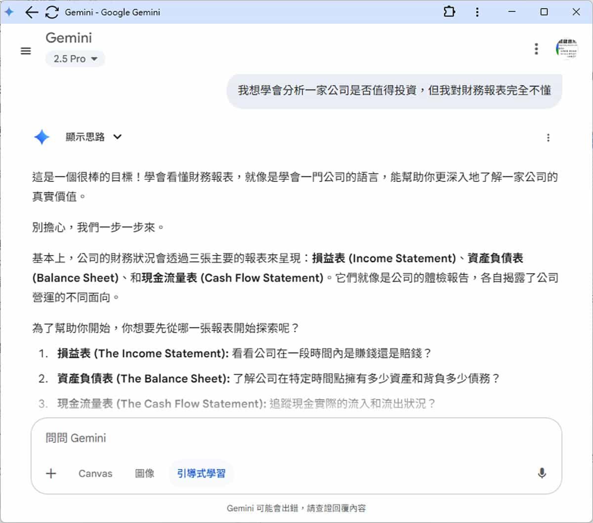 假設回答以損益表開始,接下來 AI 會以你的程度帶領你進入損益表的應用領域。