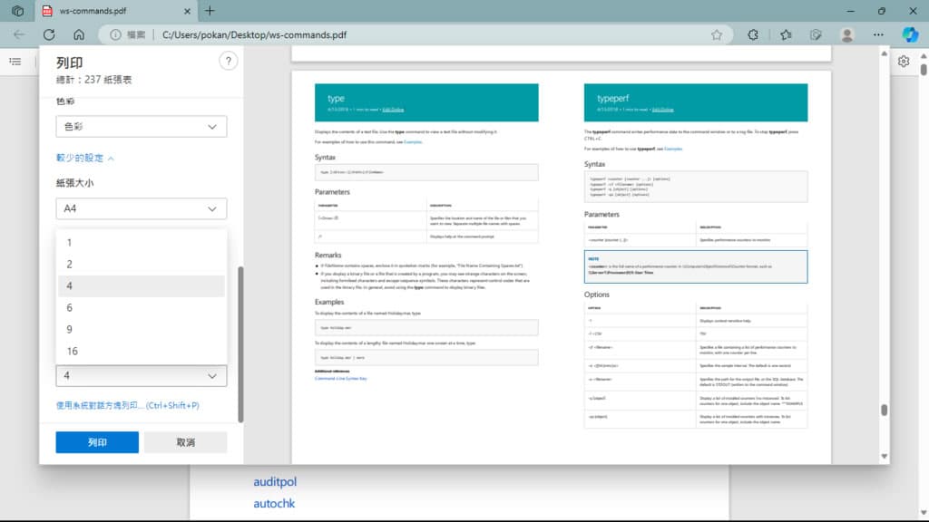 不論是實體印表機或是 Microsoft Print to PDF 虛擬印表機,其設定方式都是一樣。如果是準備上傳到便利店,像是全家或是 7-11,就直接使用 Microsoft Print to PDF 先做出多頁合併列印的 PDF 檔案再上傳列印。