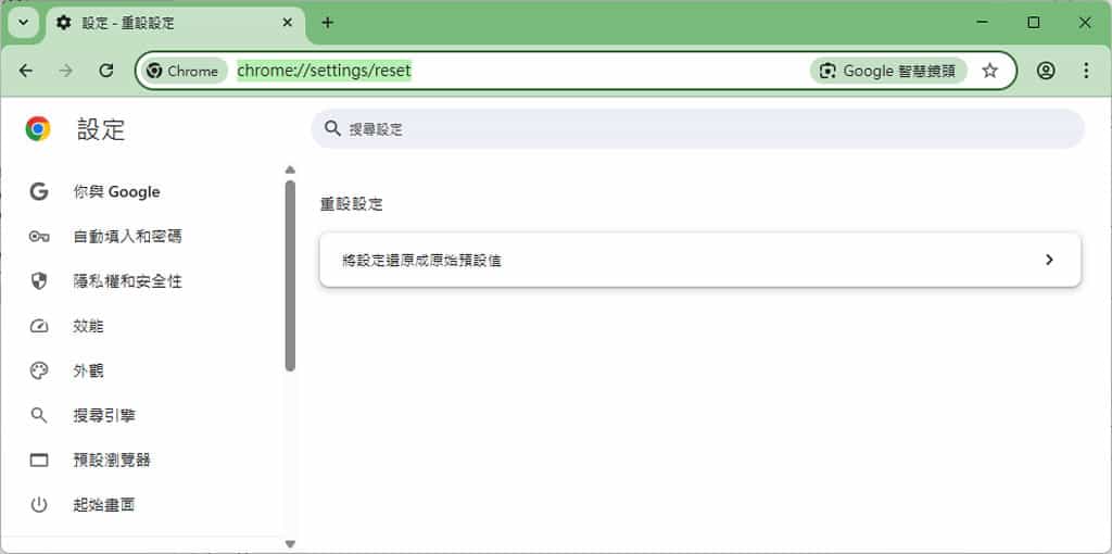 3.點選「重設設定」按鈕即完成重設。另外,也可以參閱 Google 對 將 Chrome 設定還原為預設值的說明。
