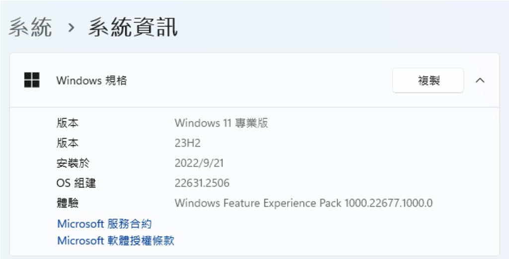 5.完成更新後,在設定視窗中便可以查看 Windows 版本號。
