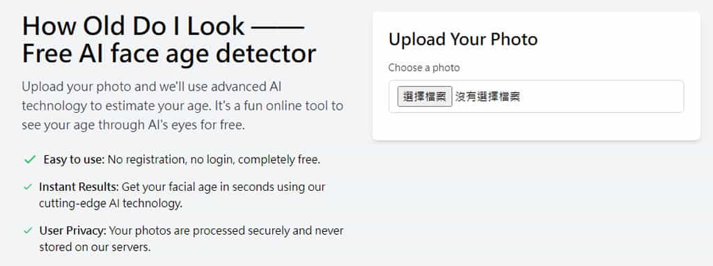 首頁線上工具未分類 How Old Do I Look:免費線上 AI 年齡分析工具,輕鬆測試你的看起來年齡 How Old Do I Look 是一個有趣的線上年齡分析免費工具,能夠快速估算照片中人物的年齡。使用方式極為簡單,使用者只需上傳一張含有臉部的照片,系統會透過 AI 技術自動識別面部位置,進一步分析臉部的特徵,如皺紋、膚質和面部輪廓,最後給出看起來的年齡結果。這個工具不僅操作方便,還為使用者提供了一種輕鬆有趣的方式來測試 AI 的準確性,至於,上傳的圖片,根據網站的說明是不會被儲存,而是在分析後立即刪除。 🔔 不錯過任何精彩! 立即訂閱我們的 LINE 官方帳號 每次發佈新文章時,您將會第一時間收到本站文章連結通知,輕鬆掌握最新資訊! 使用 LINE 追蹤文章更新 §相關文章,還可以參閱:「半夜亂取的名字」爆紅全球!Google揭密 Nano Banana 命名背後的意外故事Luckydraw:最佳線上抽獎工具,適合尾牙、婚禮及各項活動抽獎Google 宣布 goo.gl 縮址服務即將停止 ,但已建立的永久有效麥當勞廣告說漢堡王分店少,來看看漢堡王的廣告如何回應買電腦嗎?利用舊機換新機,微軟就幫你出 2000 ~ 5000 的現金補助款 上傳含臉部的照片,即可讓 AI 分析你的臉部特徵並給出看起來的年齡結果 1.進入到 How Old Do I Look 網站,頁面上有說明檢測方法及上傳圖片在分析後的處理方式。 2.點擊「選擇檔案」來上傳人物照片。 3.點擊「Analyze」就會開始上傳與分析。 4.最後,會顯示分析結果。 類似 How Old Do I Look 的網站其實不少,且多數都提供免費服務。不過,這類工具的分析結果準確性因人而異,主要取決於照片品質與算法特性,因此建議將其作為一種趣味性測試來看待,享受其中的娛樂效果,而不必過於認真對待結果。 How Old Do I Look網站網址:https://howolddoilook.me/