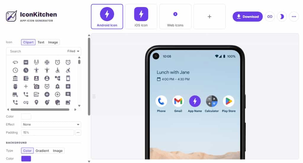 IconKitchen 是一個免費的線上應用程式圖示產生器,專為產生適用於 Android、iOS、Web、macOS、watchOS、tvOS App、Android TV Banner 及 Play Store Banner 等作業系統及平台的 App 圖示而設計。IconKitchen 提供多樣化的設計工具,其中包含圖示主要圖案可以使用 Clipart(網站提供)、Text(自訂文字)或 Image(自行上傳圖片)來加入圖示要使用的圖案或文字。此外,使用者還可以輕鬆調整圖示整體的顏色、背景和形狀,產生符合各平台需求的 PNG 格式圖示。生成的圖示可以在 IconKitchen 所模擬的作業系統或平台中直接預覽,快速查看最終效果,確保產生的圖示與目標環境能完美契合。