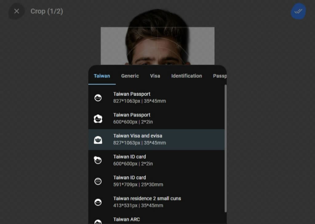 IDIFY 是個可用來建立證件照的免費線上工具,圖片上傳後,IDIFY 就會自動將圖片背景去除,以透明保留或是方便後續填充其他顏色,接下來,使用者就可以透過所提供的旋轉、放大或縮小工具來對齊輪廓線,而尺寸調整則可以自行選用內建在系統內且符合台灣規範的護照、身分證、ARC、evisa 等證件尺寸,當然,如果希望寬鬆點,也可以用其提供的通用型證件尺寸規格,讓即使沒有圖片編輯技巧的用戶,也能輕鬆且快速建立自己所需的證件照。