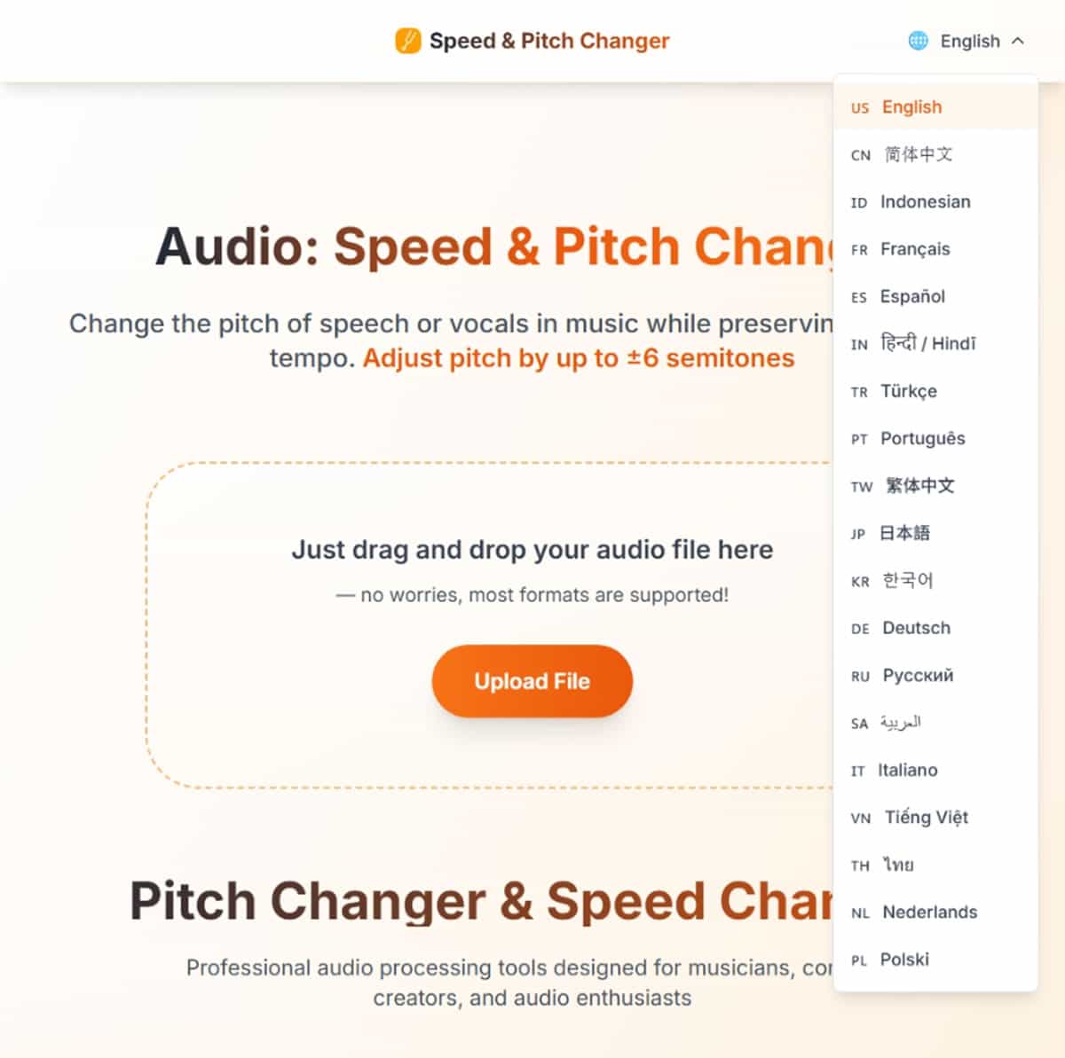 你可以在 ±6 個半音 的範圍內自由調整音高,而且完全不會影響到原本的節奏和速度。不管是想要把男聲調成女聲音域,還是讓女聲降到男聲範圍,都能輕鬆做到。
