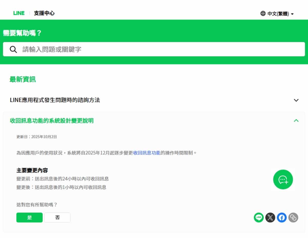 擔心這是網路謠言嗎?別擔心,這個消息是千真萬確的官方公告!你可以直接到 LINE 的官方支援中心 查看這則「收回訊息功能的系統設計變更說明」。