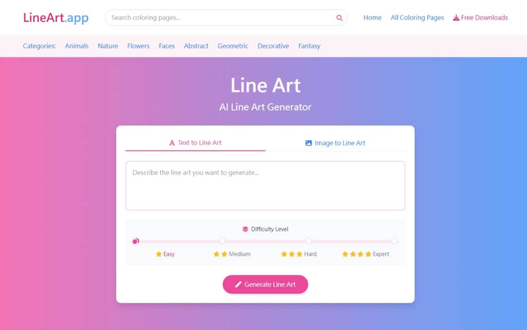 LineArt.app 是一個完全免費、免註冊的 AI 線條圖生成平台,提供 Text to Line Art(文字指令轉線稿) 和 Image to Line Art(圖片轉線稿) 兩大核心功能。只需輸入像是 Cute cat(可愛的貓咪)這類英文提示詞,就能立即獲得細膩的線條圖。系統還貼心提供 Easy、Medium、Hard 與 Expert 四種複雜度等級,讓你根據需求選擇最適合的圖案風格,無論是做著色圖紙、筆記插圖、設計草圖或教學素材都十分實用。