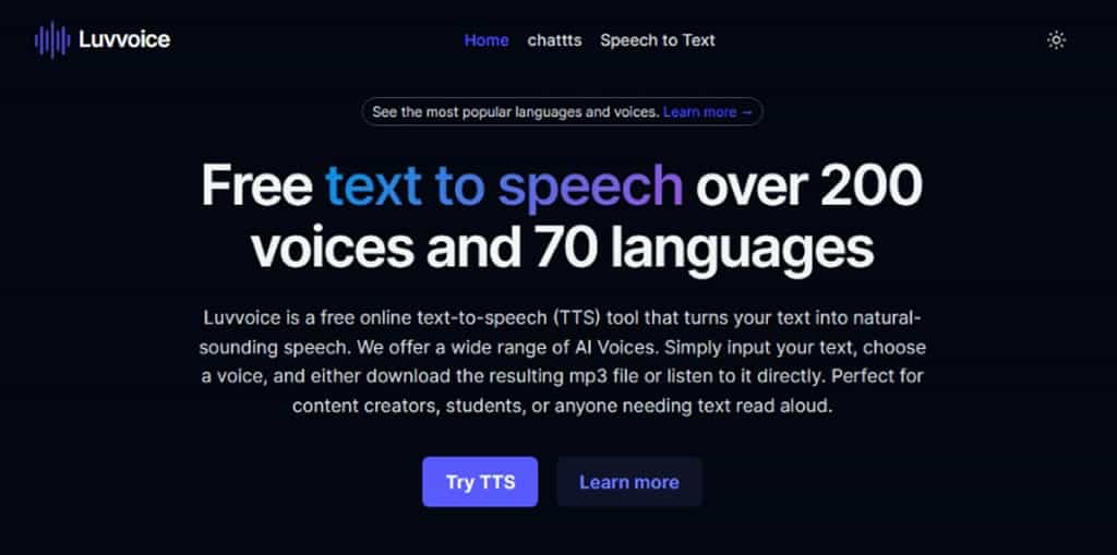 首頁線上工具影音視聽 Luvvoice:免費線上文字轉語音工具,支援 70 種語言及 200 種語音 Luvvoice 是一個免費的線上文字轉語音 ( TTS ) 工具,能夠將文字轉換為自然流暢的語音。Luvvoice 支援超過 70 種語言和 200 種人工智慧語音,包括 English、Spanish、Chinese、Arabic 和 Italian 等主要語言。使用這個工具非常簡單,只需輸入要發音的文字內容,選擇語音,然後交由 Luvvoice 處理生成語音。完成後,可以下載生成的 MP3 檔案或直接在線上收聽。Luvvoice 無需註冊,且不設使用次數限制,唯一的限制是每次處理的字數上限為 6000 字。這使得 Luvvoice 成為內容創作者、學生或任何需要大聲朗讀文字內容的人的理想選擇。 🔔 不錯過任何精彩! 立即訂閱我們的 LINE 官方帳號 每次發佈新文章時,您將會第一時間收到本站文章連結通知,輕鬆掌握最新資訊! 使用 LINE 追蹤文章更新 §相關文章,還可以參閱:sound&go 耳機測試工具:免安裝測左右聲道、頻率響應Veo 3.1「材料轉影片」功能升級:支援直式影片與 4K 畫質來了!OpenAI Sora Android 版上線 Google Play,台灣用戶同步開放Google 親授 Veo 3.1 用電影語言與音效設計打造完美 AI 影片Sora Watermarker:一鍵為影片加上 OpenAI Sora 浮水印 支持多語言和人工智慧語音,6000 字字數限制,可下載成 MP3 檔案 1.進入到 Luvvoice 網站,無須註冊即可以輸入想要 Luvvoice 發音的文字內容,字數有 6000字的限制。 2.接下來選擇語言及想要使用的 AI語音,以中文來說,包含簡、繁體,還可以以廣東話來發音,完成選擇,按「Submit」進行轉語音的處理。 3.完成後,可在線上利用內建的播放器收聽語音效果,滿意後,可以按「Download」按鈕下載 MP3 語音檔。 Luvvoice 支援 70 種語言及 200 種語音,語音自然且流暢。文中以韓愈「師說」為範例,可以試聽看看也可以下載。 您的瀏覽器不支援。 Luvvoice網站網址:https://luvvoice.com/