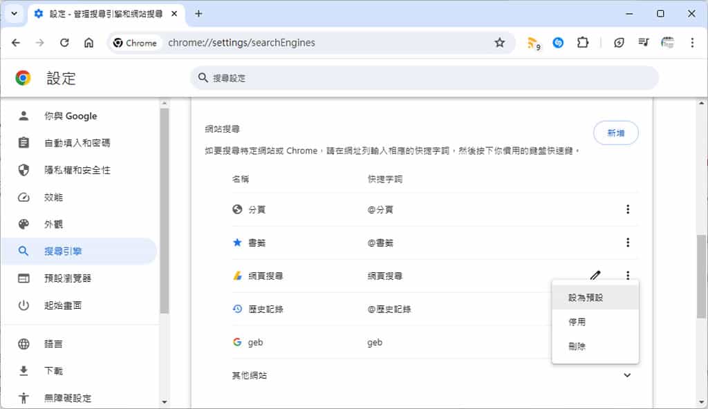 接下來開啟 Chrome 瀏覽器的「設定」功能,進入「搜尋引擎」設定頁面。