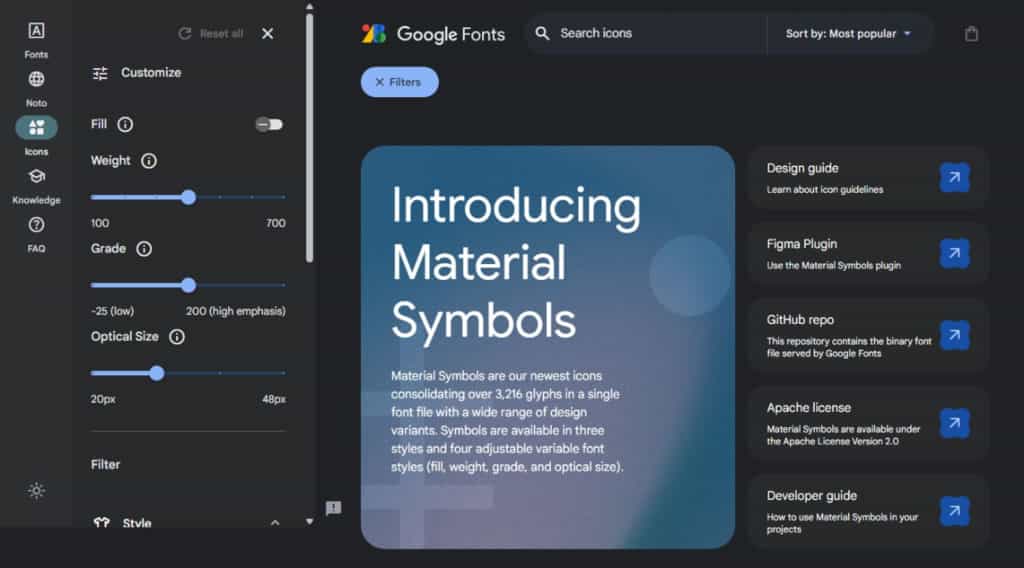 Material Symbols & Icons 是一套由 Google Fonts 所推出的圖示字型,將超過 3,216 個字形整合到一個字體檔案中,並具有多種設計變體。每種圖示都提供 Outlined、Rounded 及 Sharp 三種樣式以及 Fill、Weight、Grade 及 Optical Size 四種可調節的可變字體樣式,並讓使用者自行選擇要以字型或是 SVG、PNG 圖檔格式下載。使用者可以在線上自行操作設定圖示並複製所提供的 CSS 及 HTML Code,輕鬆將其應用到自己的 Wwb、Android 或是 iOS 專案中。此外,該圖示套件還支援 Figma Plugin,在 Figma 中輕鬆使用。Material Symbols & Icons 採 Apache license 授權,這表示不論是個人還是商業使用均可。