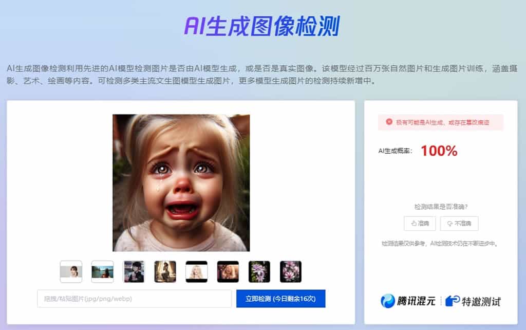 此外,AI 生成影像檢測則透過先進 AI 模型分析圖片是否由 AI 生成,或是否為真實影像。該模型經過百萬張自然圖片與 AI 生成圖片的訓練,涵蓋攝影、數字藝術、繪畫等領域,能夠檢測多種主流文生圖(Text-to-Image)模型產生的圖片,並將持續更新以支援更多 AI 生成圖像的識別。使用「朱雀大模型檢測」無需註冊帳號,但目前設有每日檢測次數限制,每位使用者每日最多可檢測20 次文本與 20 次圖片。