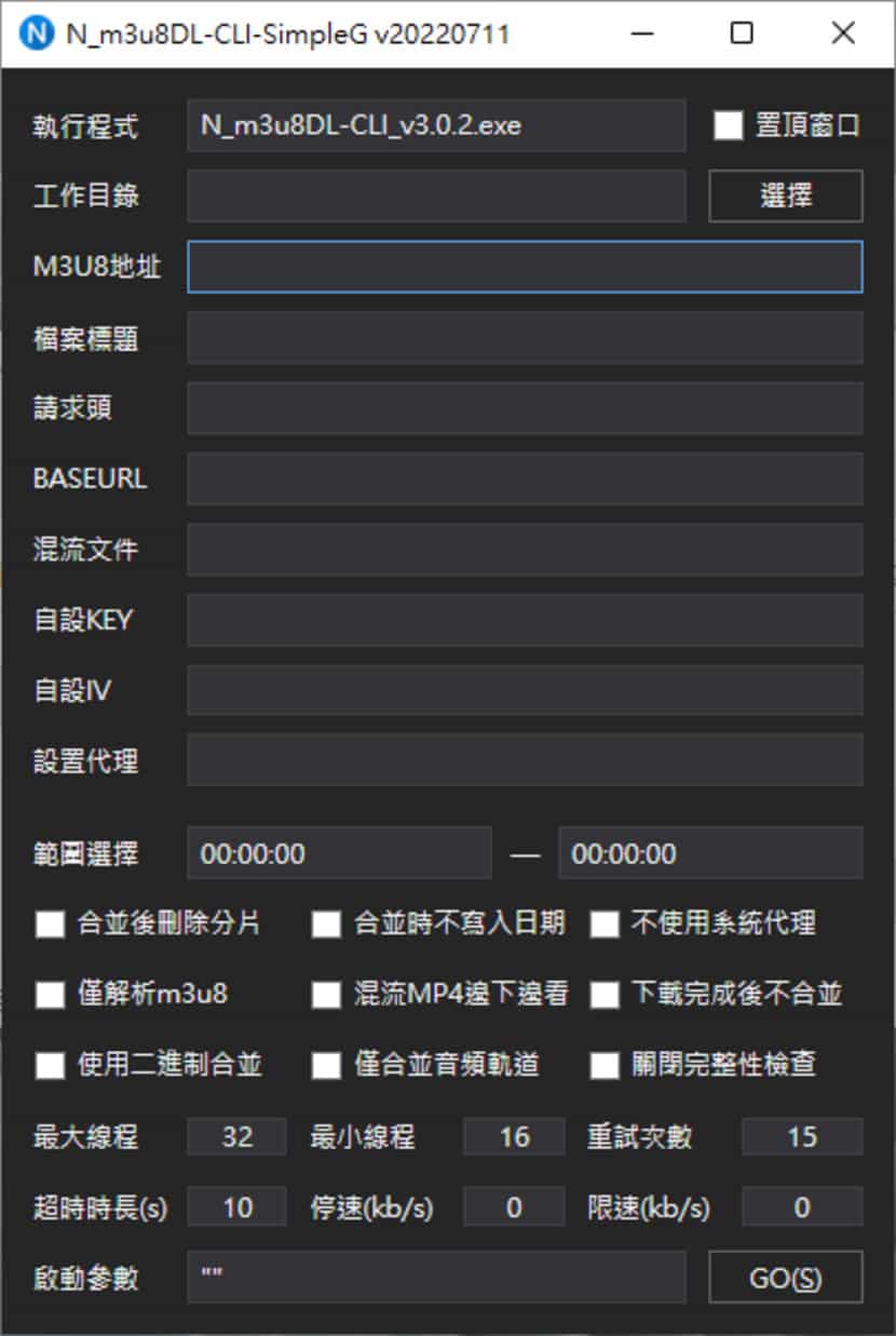 3.開啟 N_m3u8DL-CLI-SimpleG.exe 後,可以看到介面,其中需填入「工作目錄」就是檔案下載後存放的資料夾、「M3U8 地址」及「檔案標題」檔案下載後的檔案名稱等參數。