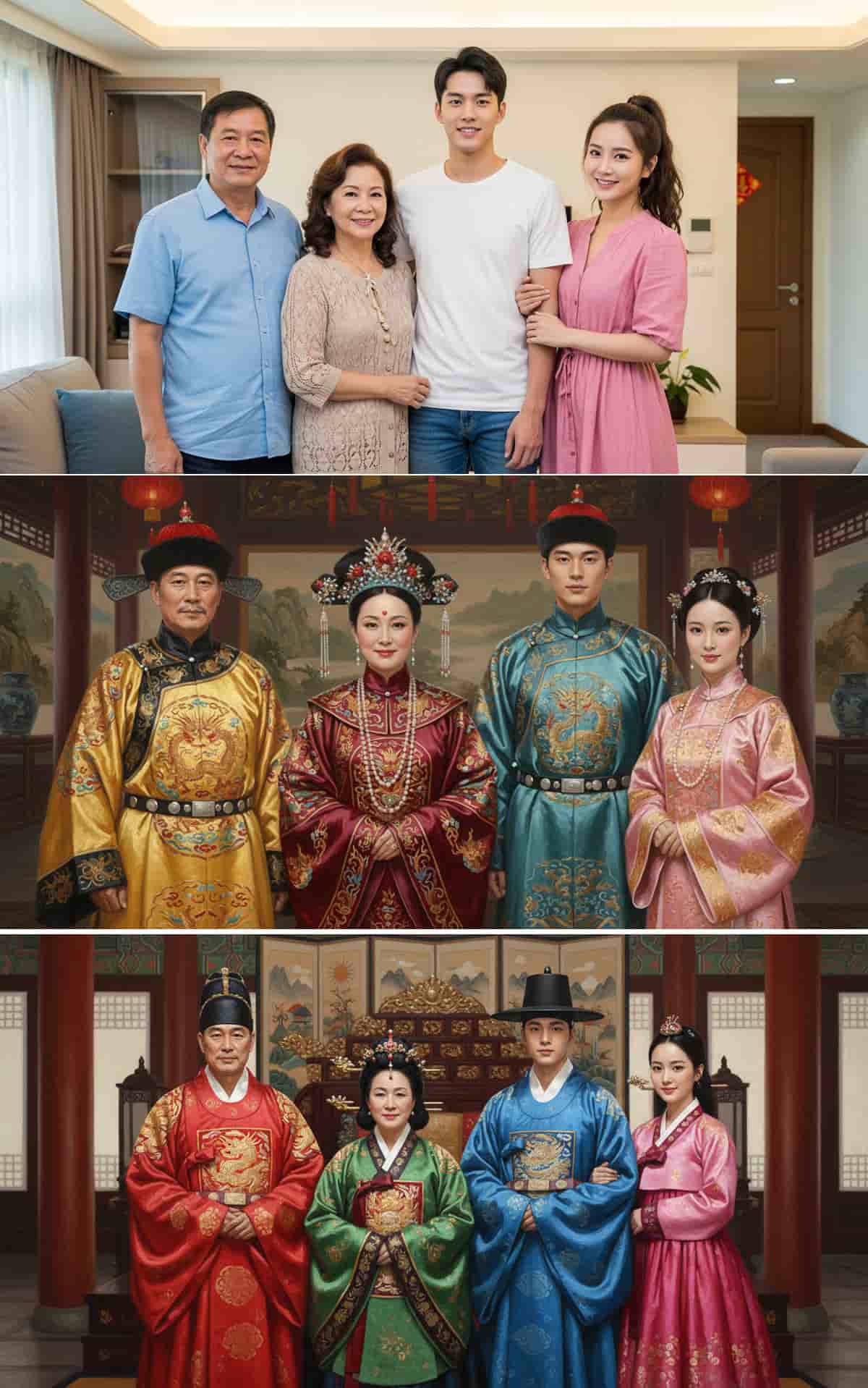 將這三人(此處需註明具體人數)的全家福,改編成一幅19世紀印度王公油畫風格的皇家全身肖像。 100%保留人物臉部特徵,同時增強其莊嚴的表情和姿態。人物莊嚴站立,身著皇家服飾,佩戴珠寶,一家之主(男性)手持鑲嵌寶石的儀式用劍。