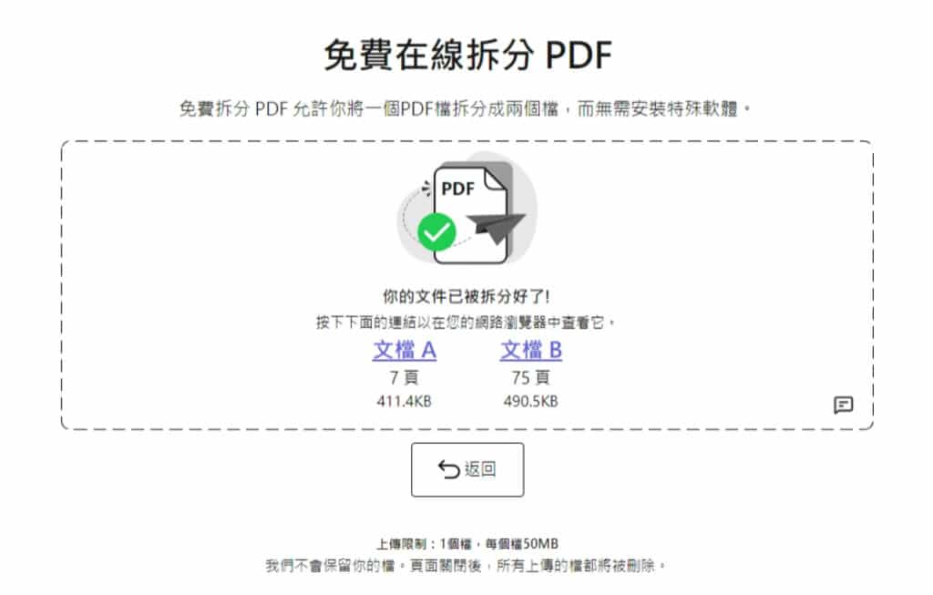 3.Split PDF 也很簡單,只要設定要拆分的頁數後點擊「拆分文檔」按鈕,就可以拆成兩個 PDF 檔案。