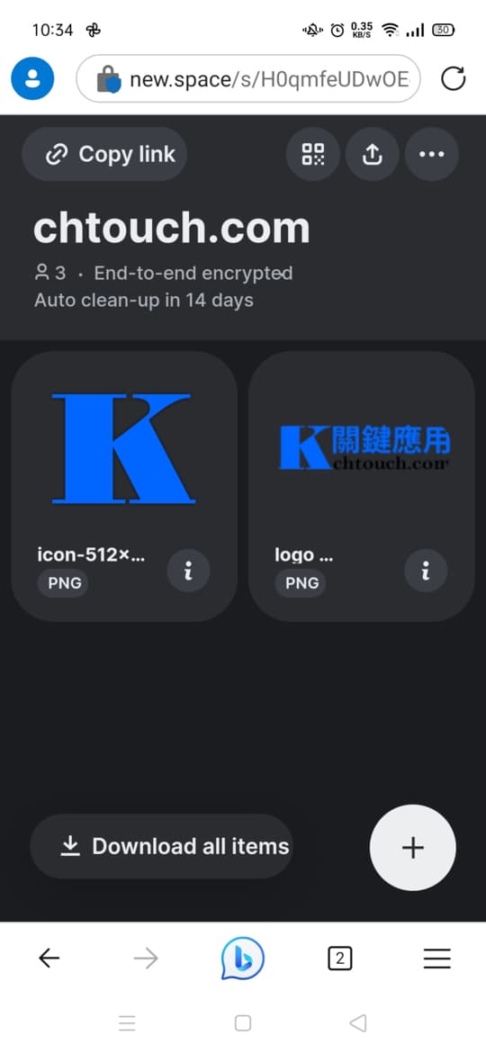 進入 New.Space 網站就等於建立了一個檔案儲存空間,而該空間的網址就是在網址列的網址,可按「Copy link」或其旁的 QR Code 圖示按鈕來傳送儲存空間網址給想要共同參與的人員。