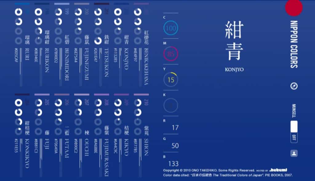 首頁線上工具開發工具 NIPPON COLORS 探索 250種日本傳統色彩,即時獲得 CMYK、RGB、HEX 色碼 Nippon Colors(日本の伝統色)是一個以收錄日本傳統色系為主的網站,提供超過 250種曾在日本古典文學、手工藝、和服以及其它傳統藝術中出現的顏色。每種色彩都擁有獨特的專屬名稱,呈現出明度較低且質感清雅的特色。只要點擊其中任一顏色,網頁背景就會即時轉換為該色,同時 Nippon Colors 還會顯示該色彩的名稱,並提供CMYK、RGB、HEX 等色碼資訊。這使得在平面設計或網頁設計中,能夠直接獲取所需色彩的相關資訊,輕鬆應用於實際創作。 🔔 不錯過任何精彩! 立即訂閱我們的 LINE 官方帳號 每次發佈新文章時,您將會第一時間收到本站文章連結通知,輕鬆掌握最新資訊! 使用 LINE 追蹤文章更新 §相關文章,還可以參閱:網站效能健檢免費工具!PageTest 多裝置模擬效能分析及由 AI 提出改進建議Regex-Vis 圖解正則表達式的線上工具,可編寫還可驗證Sitemap Generator:線上快速產生符合 SEO 標準的網站地圖,無網址數量限制適用各類型網站網站隱私權政策產生器 Privacy Policy Generator:輸入網站名稱和網址即可輕鬆生成專屬條款Frame0:輕鬆繪製應用程式流程圖、UML 和介面雛形的免費工具,適用於 macOS 與 Windows NIPPON COLORS 網站使用方式: 1.進入 NIPPON COLOR S網站後,系統將自動隨機展示一種傳統顏色,並提供當前顏色的色彩名稱以及相應的色彩值,包括 CMYK、RGB 及 HEX 色碼。 2.頁面左側有 001 至 255 編號是所提供的顏色編號,可以使用滑鼠點擊,點擊後,整個頁面就會轉化為該顏色呈現,讓使用者可以大範圍的預覽。 3.頁面中間會提供 CMYK、RGB、HEX 等色碼資訊。 4.最後,開啟「Munsell」模式會進入動態模式,利用色彩的明度、色相和彩度三個維度來描繪顏色。 NIPPON COLORS | 日本の伝統色網站網址:https://nipponcolors.com/
