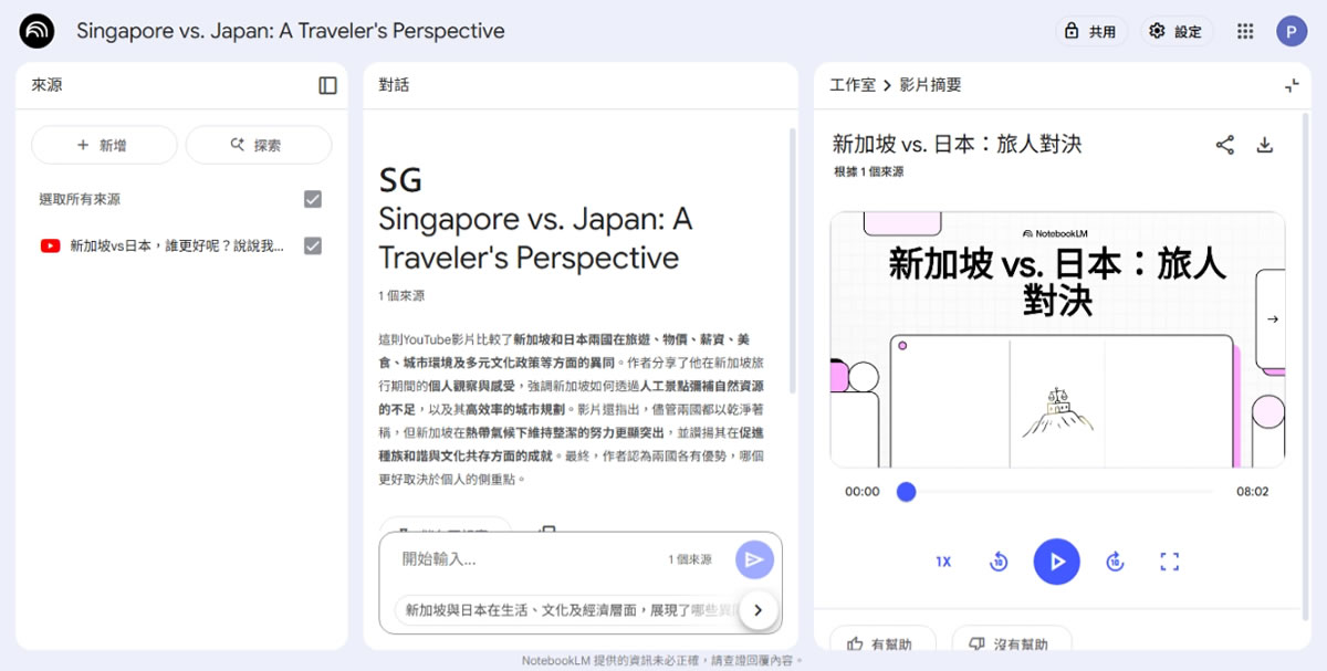 更重要的是,現在支援繁體中文輸出後,不管原始資料是什麼語言,都能產出我們熟悉的中文講解影片。這不僅大幅提升了學習效率,也讓知識吸收變得更加輕鬆有趣。無論你是學生、研究者、商務、旅行還是內容創作者,這個功能都能成為你的得力助手,將複雜的資訊瞬間轉化成易懂的影片內容。
