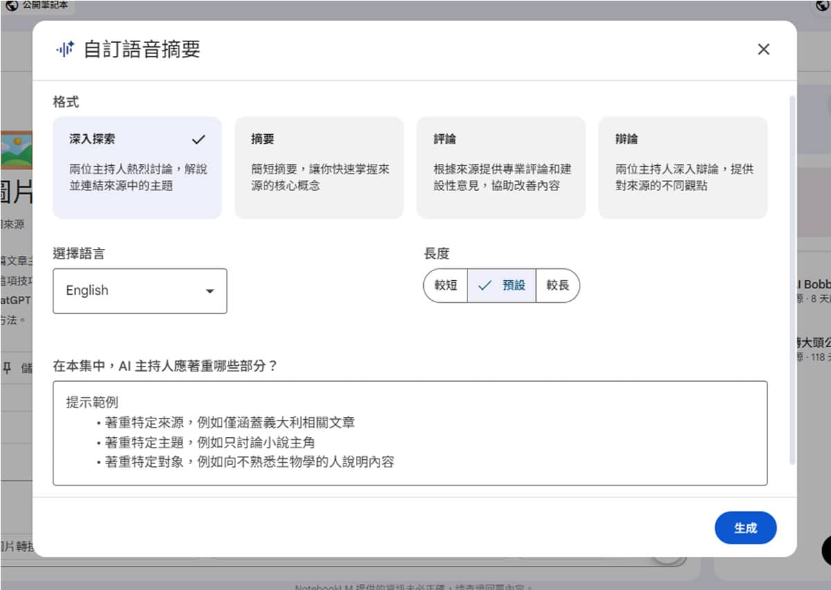 建議你可以用同一份資料分別生成不同格式,比較看看各種聲音和對話風格的不同之處!