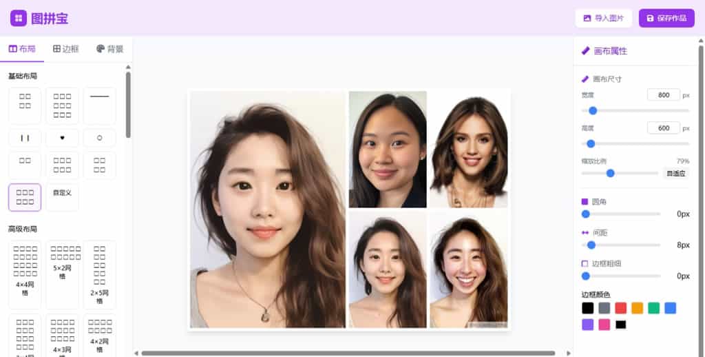 相較於以往所見的圖片拼貼工具,「圖拼寶」提供了更多可自訂的拼貼選項,讓使用者能夠細緻調整布局、邊框、背景及畫布設定,甚至自行設計專屬拼貼樣式。無需下載軟體,直接透過瀏覽器即可免費使用,且無需註冊或擔心浮水印問題。無論是個人創作、社群分享,或是商業設計,「圖拼寶」都能輕鬆滿足您的拼貼需求