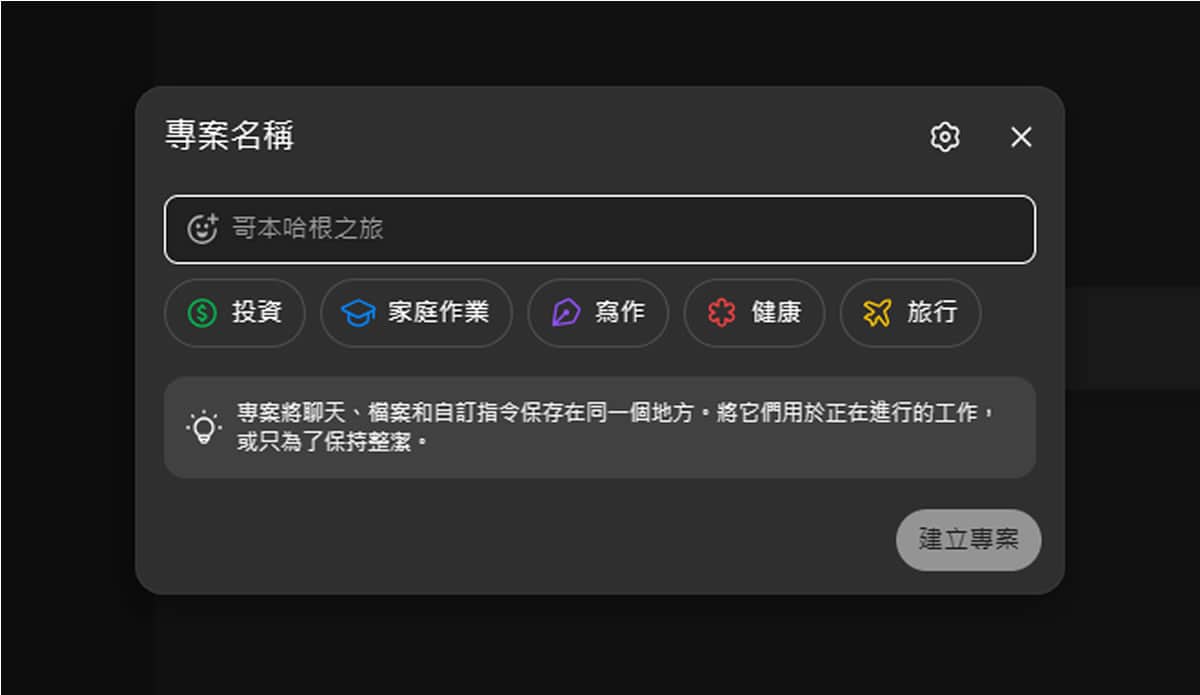 接著開始建立你的專案,輸入專案的名稱,OpenAI 提供了「投資」、「家庭作業」、「寫作」、「健康」和「旅行」五個常用選項,方便你快速點擊建立。