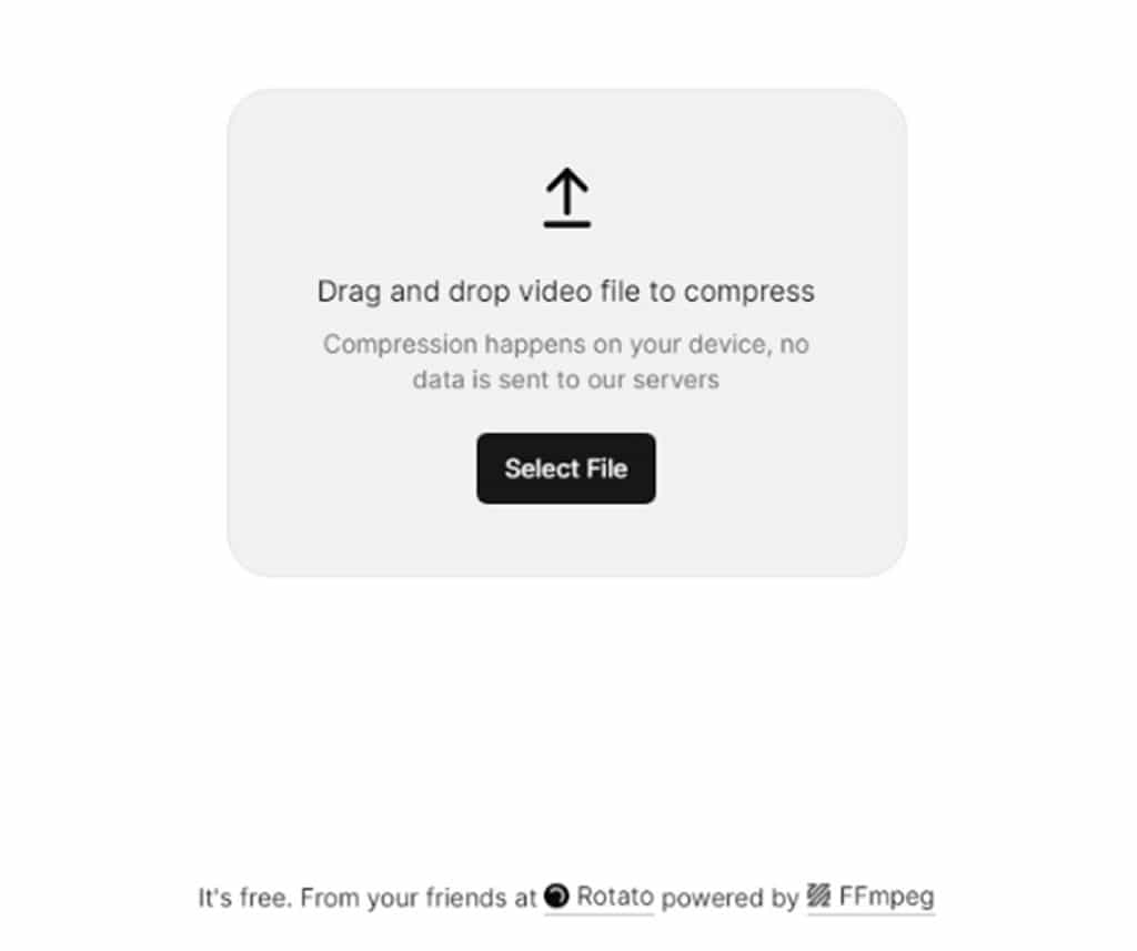 1.進入 Rotato Video File Compressor 網站後,您可以點擊「Select File」選擇檔案,或使用滑鼠將影片拖曳到標有「Drag and drop video file to compress」字樣的方框中。