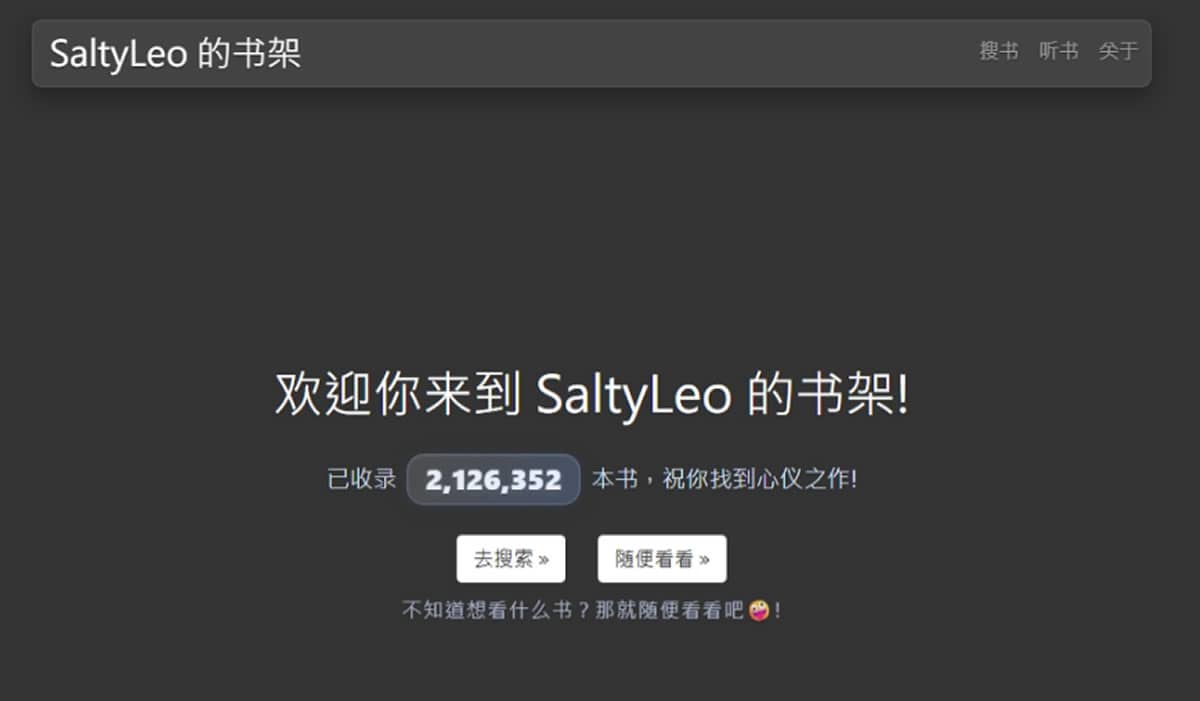 打開瀏覽器,前往 SaltyLeo 的書架,在首頁你會看到簡潔的搜尋介面,可以選擇「去搜尋」輸入關鍵字,或者點「隨便看看」探索新書籍。
