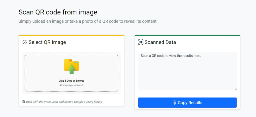 3.按照頁面指引,可以點擊虛線框內圖示來選擇 QR Code 圖片,亦可以將 QR Code 圖片使用滑鼠拖曳進虛線框內來上傳。一經上傳的 QR Code,便會立刻被掃瞄與解讀。