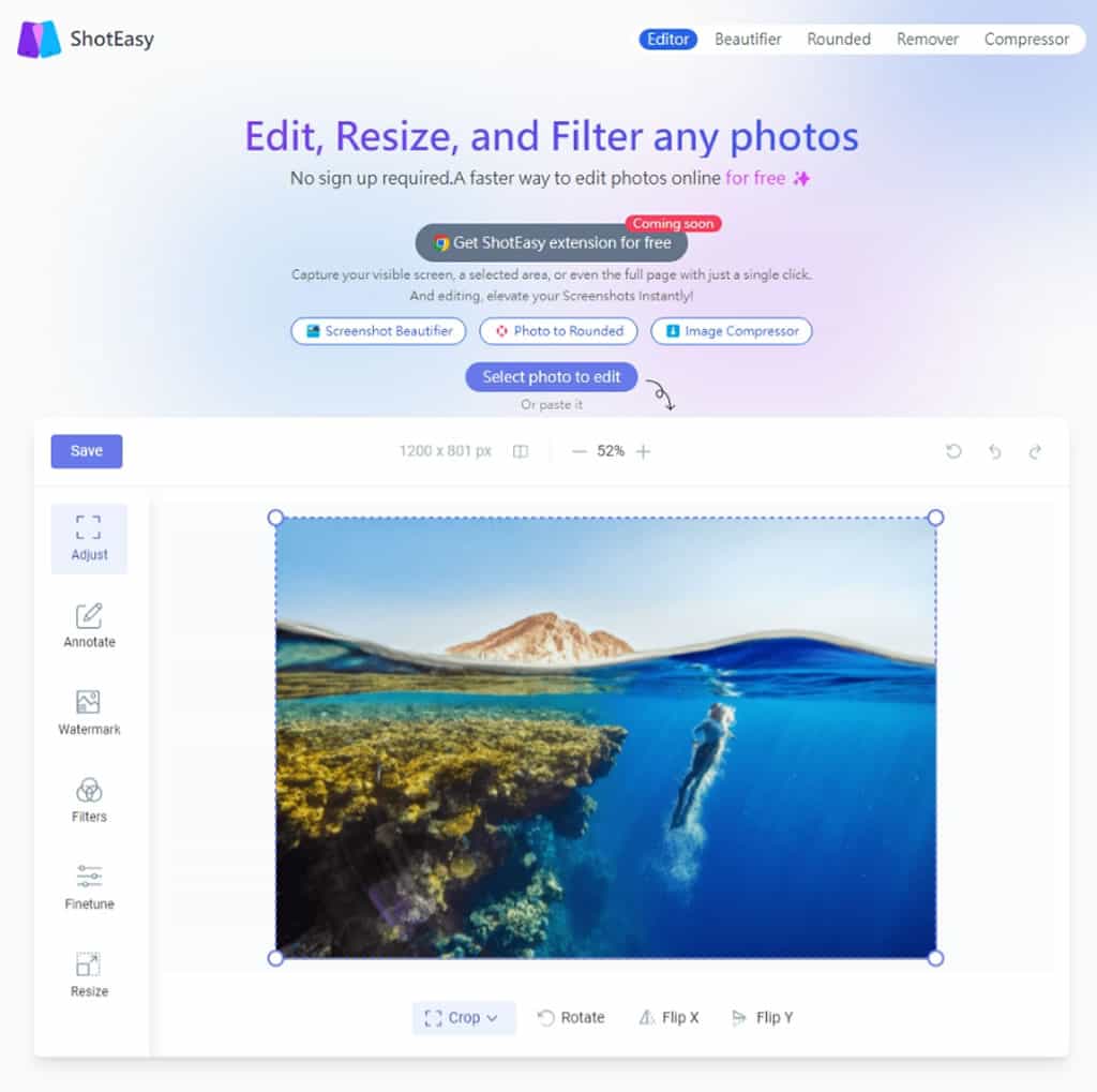 1.進入 Shot Easy 網站,預設會在圖片編輯功能頁面,而在頁面右上角可切換到截圖美化、圖片轉圓形、去背景和圖片壓縮功能。