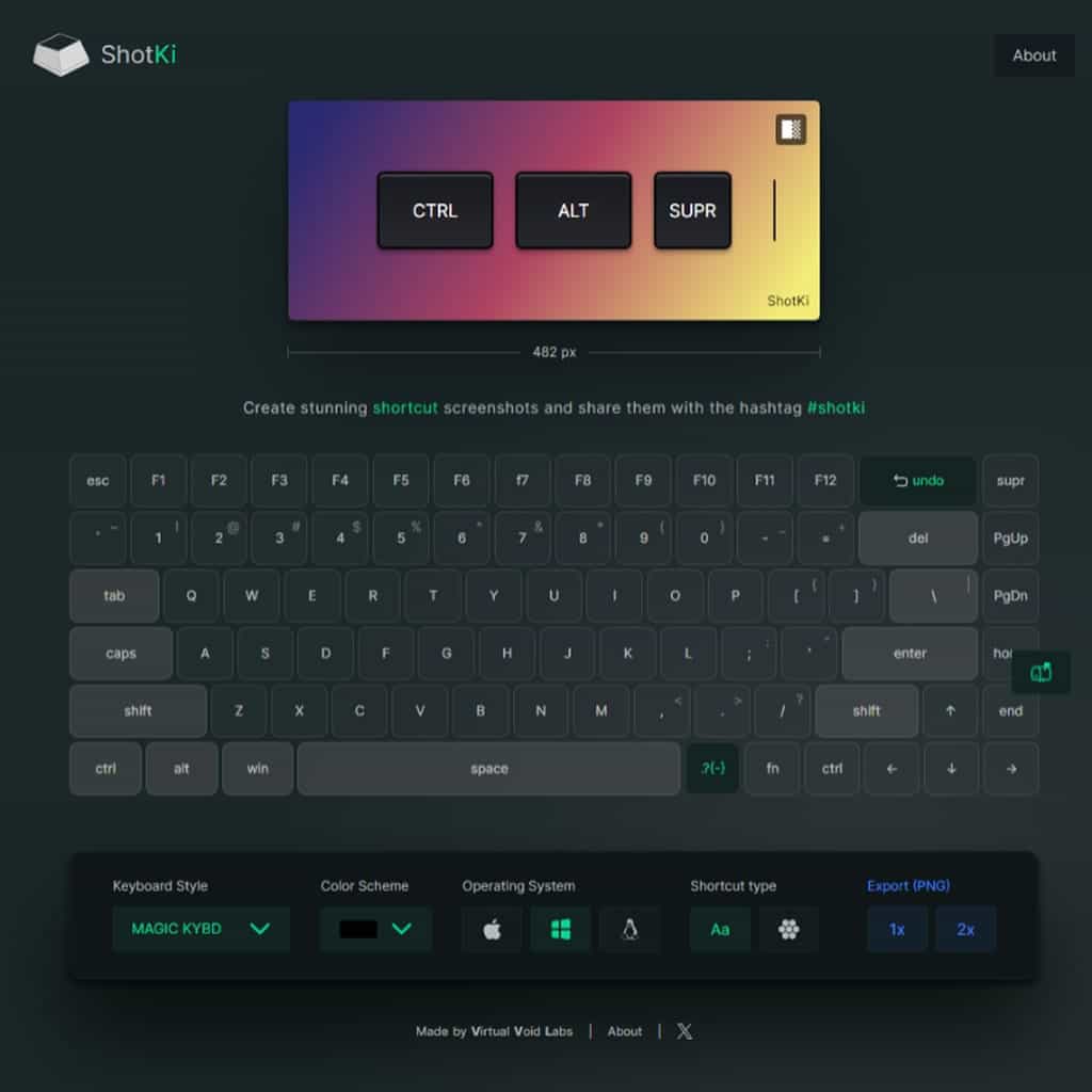 ShotKi 是一個免費的線上工具,專為產生 Windows、Mac 及 Linux 作業系統的鍵盤快速鍵圖片而設計。以往要說明作業系統的鍵盤快速鍵組合時,例如 Windows 的「複製」功能會以 Ctrl + C 來表示,但如果透過 ShotKi 就可以快速製作成一張圖片,嵌入到說明文件內,讓文件看起來更為專業。ShotKi 不但提供符合 Windows、Mac 和 Linux 三種作業系統的虛擬鍵盤,讓即便不是在該作業系統的使用者也可以應用外,還貼心的提供多種模板及顏色供使用者選用,甚至還可以選擇透明背景,方便更好的融入文件或簡報中。