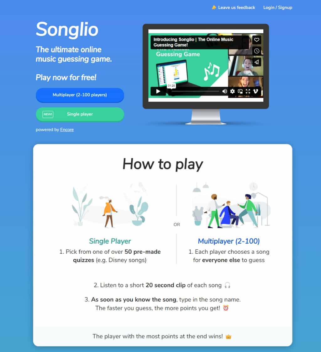 Songlio 是一個聽歌曲前 25秒猜歌曲名稱的線上遊戲,可以單人玩亦可容納 2 至 100 個玩家。 Songlio 除了有現成的題庫可以直接使用外,還可以由使用者自行選曲建立自己的歌曲列表來使用。遊戲的過程很簡單,首先所有參與玩家都須建立名稱,接下來選擇題庫。遊戲開始後,每首歌曲會播放歌曲開頭的前 25秒,並在最後 10 秒後提供提示,幫助玩家更快猜出歌曲名稱。當所有玩家完成猜題後,系統會顯示一個即時的排行榜。不過比較可惜的是全過程需要用英文,即便是張學友、伍佰或周杰倫這類的中文歌曲,都只能用歌曲的英文名稱,或是直接用歌手名稱來答題。