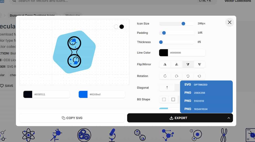 此外,SVG Repo 的圖示以成套且風格一致的方式呈現,每套圖示都會明確標示其授權方式,確保使用者能夠合法使用。網站還提供了強大的線上編輯工具,讓使用者可以直接在平台上調整圖示的尺寸、顏色、線條粗細、翻轉、旋轉、對角線及背景形狀等。編輯完成後,您可以將成品下載為 SVG 圖檔格式,或是選擇三種不同尺寸的PNG圖檔格式,方便應用於各種設計場景。