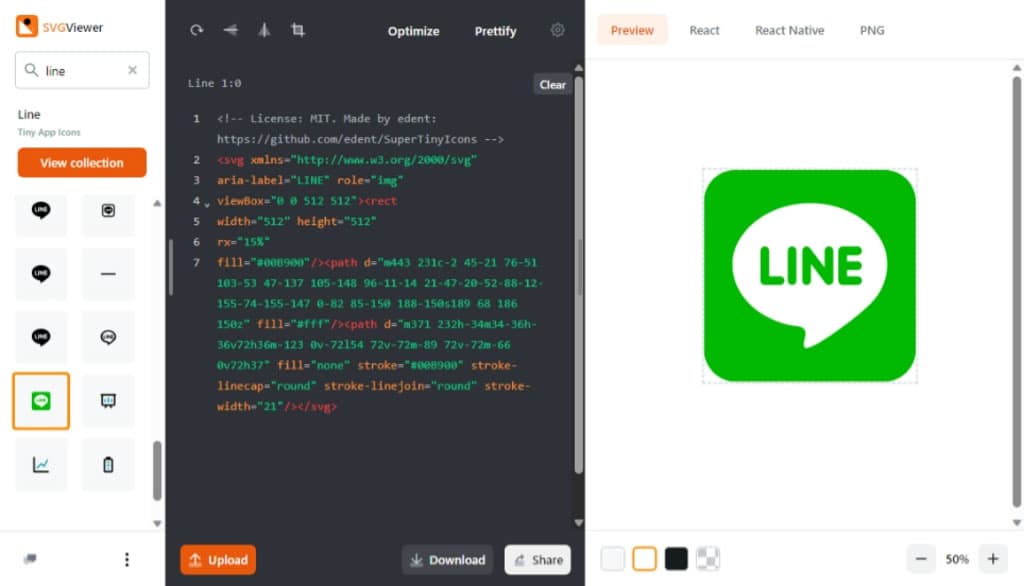 SVGViewer 是一個很實用的線上 SVG 檢視器,使用者可以直接上傳 SVG 圖檔或是貼上 SVG 的 XML 描述文字,便可以查看該 SVG 圖像,除此之外,SVGViewer 還可以對圖像進行方向旋轉、調整尺寸、最佳化及美化,有效減少 SVG 圖檔大小,另外,亦可轉檔為 PNG 圖片格式,或是轉換成 React、React Native 使用的 JSX 格式,非常方便。如果想要分享 SVG 檔案,也有提供產生分享鏈結功能。