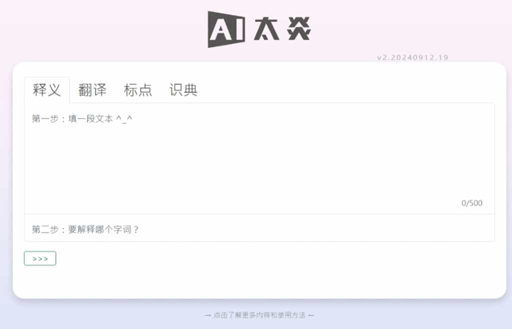 1.進入「AI太炎」網站,可以看到釋義、翻譯、標點、自動識別典故四大功能,預設會顯示釋義功能。